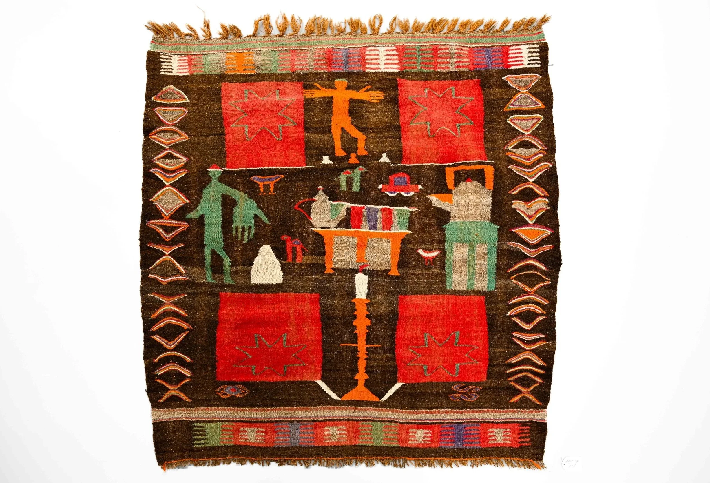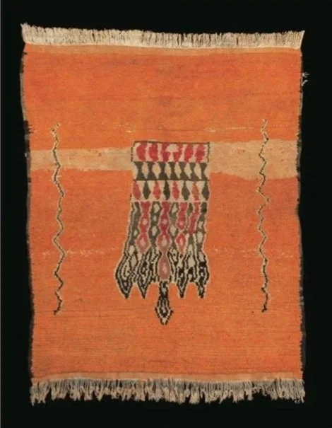 Carpet (Tapis), wool. Boujad, Middle Atlas. Bert Flint Donation. Pierre Bergé Museum of Berber Arts and Musée Yves Saint Laurent Marrakech. Since the Neolithic Age, Amazigh carpets have been woven using a vocabulary of signs and techniques specific to each region. This symbolic, protective and esoteric vocabulary, whose meaning has been lost over the centuries, has been passed from mother to daughter for generations.